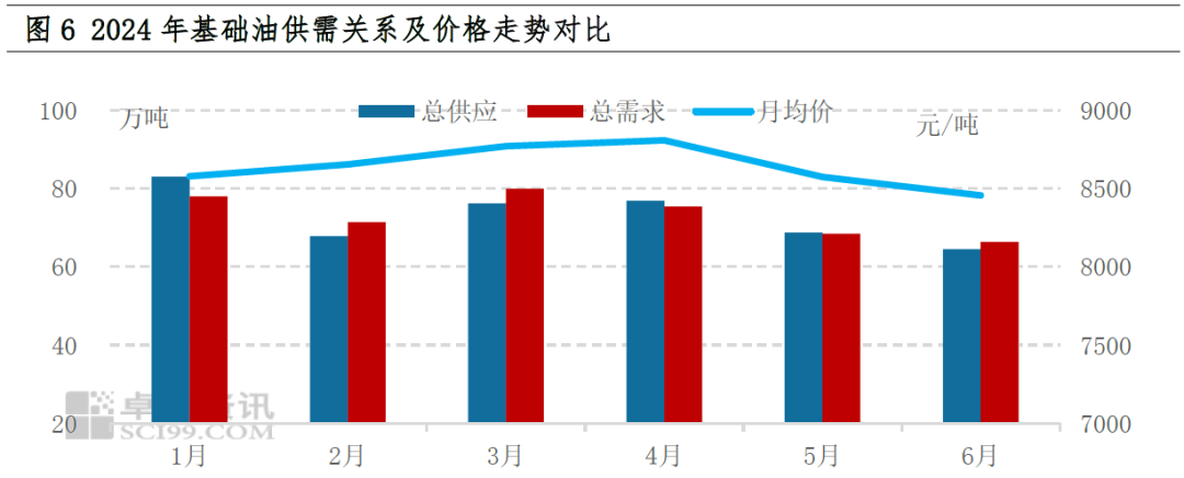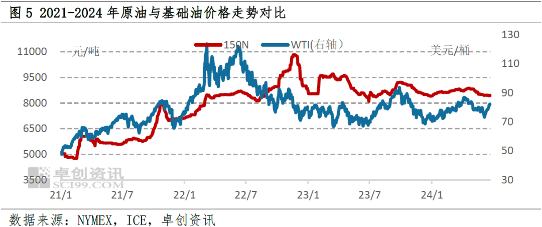 基础油具有多种生产工艺,但其源头原料主要为原油,2024年上半年原油在77-87美元/桶区间内震荡,对于基础油的成本支撑相对明显,一定程度上造成基础油市场价格居高不下。