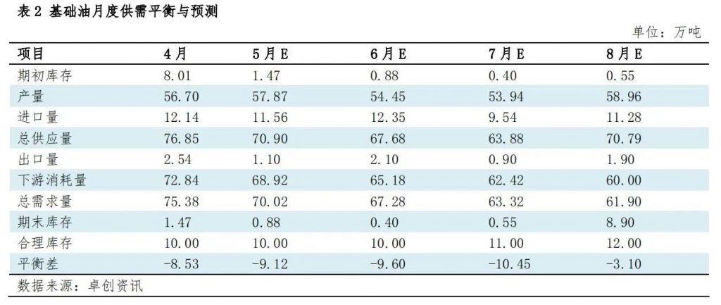 - 供应方面:预计7-8月,7月检修增加,基础油资源供应或降至年内新低。但随着装置检修完毕,8月份行业开工负荷回暖,资源供应增加明显。预计7-8月,基础油产量分别为53.94万吨、58.96万吨。进口资源先减后增,但整体进口数量缩减。