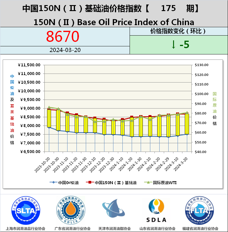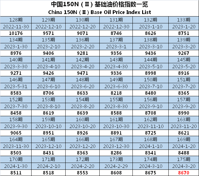 摘要:中国150N(Ⅱ)基础油价格指数第175期-行情平稳运行