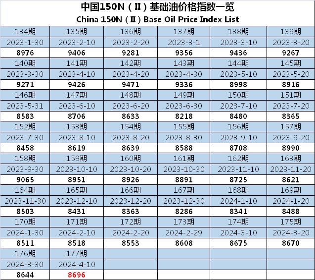 摘要:中国150N(Ⅱ)基础油价格指数第177期-持续回暖量价齐升