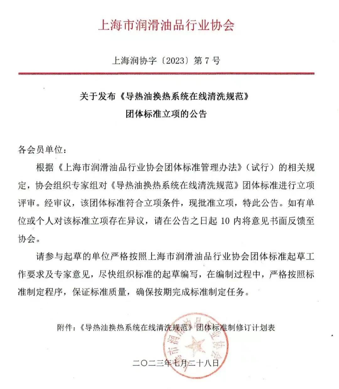 根据《上海市润滑油品行业协会团体标准管理办法》(试行)的相关规定,协会组织专家组对《导热油换热系统在线清洗规范》团体标准进行立项评审。经审议,该团体标准符合立项条件,现批准立项,特此公告。如有单位或个人对该标准立项存在异议,请在公告之日起10内将意见书面反馈至协会。