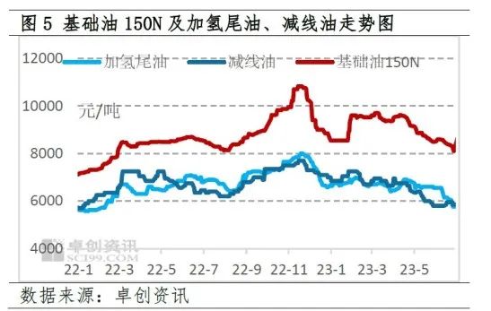 加氢尾油上半年也以震荡下跌为主,截至6月30日,山东地区加氢尾油均价为5760元/吨,减二线价格为5850元/吨,与年初相比原料成本分别下调13.71%和16.43%,基础油原料成本出现明显下滑,对基础油市场形成一定的利空影响。