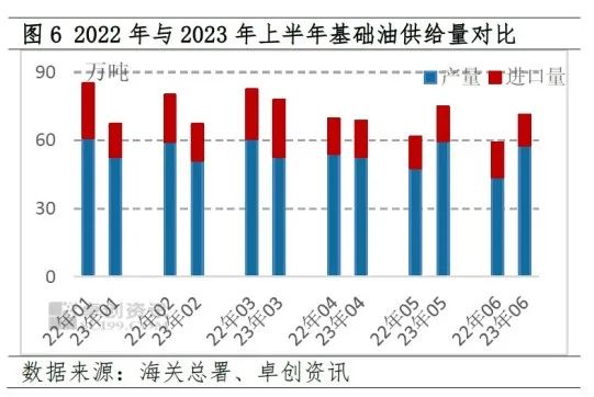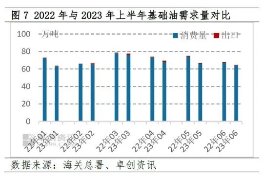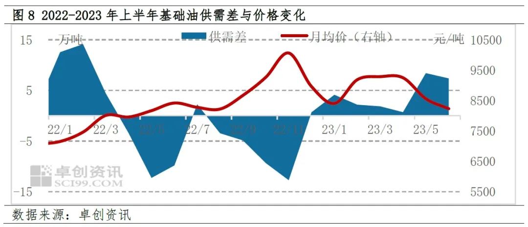 需求方面,在防疫政策优化后,国内经济于2022年11月正式步入修复通道,不过疫后经济修复仍以“场景式”恢复为主,旅游、餐饮等行业率先复苏且势头较猛,对工业品的需求拉动效果并不及预期。基础油行业亦是如此,上半年基础油国内下游消费量为402.12万吨,较去年同期下降了6.57%,预计出口仅有7.11万吨左右,总需求量为409.23万吨,较上年同期下降了5.9%,显著低于2.43%的供给降幅,并且考虑到供给基数更大,因此基础油整体供需矛盾进一步凸显,这在一定程度上加剧了基础油价格的下行压力,尤其是5、6月份随着供需差的扩大,基础油下跌速度加快。
