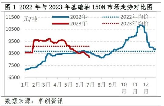 上半年国内基础油市场整体呈现高位盘整后震荡下行的趋势,其走势与我们在《2022-2023中国润滑油基础油市场年度报告》中预测的基本一致。由于上半年装置集中检修、炼厂平均开工负荷不高,基础油产量同比减少,支撑国内基础油价格呈现高起点后维持高位运行的趋势,5、6月份基础油加速下跌,并跌至8000元/吨关口,基础油价格运行趋势及价格水平与年报预测基本一致。2023年1-6月份,国内150N(全国均价、现款现汇、自提、含税,下同)均价为9086元/吨 ,较上年同期涨11.32%(见图1)。6月30日国内基础油150N均价收于8100元/吨,该价格较年初下跌了4.42%(见图1)。