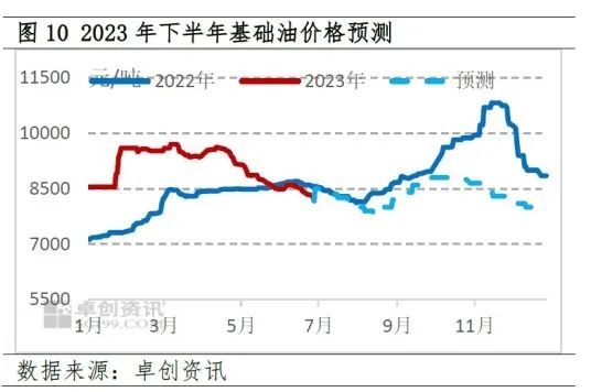 上半年基础油市场高位盘整后下行,能源价格及供强需弱的基本面共同施压市场。下半年,伴随着经济修复进程的进一步推进,润滑油需求端或边际改善,且美联储加息放缓直至暂停将缓解能源市场的调整压力。基础油市场在消费淡季磨底后将有反弹可能,但考虑到供应增速的进一步提升,基础油上方空间受限,整体预计基础油下半年价格水平在7800-8800元/吨。