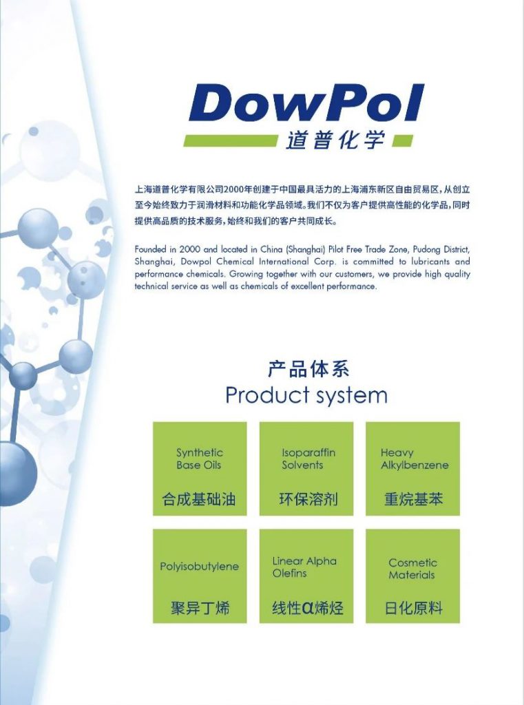 从创始至今,道普化学始终致力于润滑材料和功能化学品领域的研发、生产和销售,是亚太地区可同时提供聚α烯烃(PAO)和烷基萘(AN)系列合成基础油产品的专业公司。