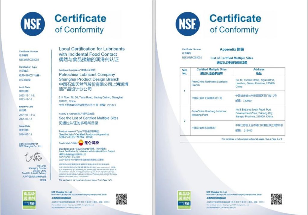 2024年3月13日,昆仑润滑食品级液压油、齿轮油获得NSF偶然与食品接触的润滑剂本地认证(中国)(简称“食品级润滑剂中国认证”),为昆仑润滑在食品加工行业的发展再添一块坚实基石。
