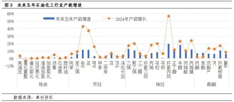 新增产能投放延期,供应压力对价格施压或降低。以2024年年初预测数据来看,2024年上半年石油化工行业新增产能投放速度有所放缓,并且部分行业新增产能投产日期计划延期至2025-2026年。2023年是化工行业投产大年,40类化工品产能平均增长15%,过去五年平均增速仅12%。2024年预计石化行业仍维持10%左右的高扩能增长,其中炼油板块沥青、芳烃板块苯乙烯及3S,烯烃板块环氧丙烷、烯烃(聚烯烃)、辛醇、丙烯腈扩能明显。酚酮板块产能增长较快的是环氧树脂、双酚A。而通过年中调研得知,多数新增产能存在项目投产延后的情况。例如炼油行业,2024年上半年暂无常减压装置投产;乙烯行业上半年新增产能仅26万吨,下半年计划新增320万吨,不及2024年出计划新增产能的80%;环氧丙烷年初计划新增产能同比达57%,以当前情况看,年底落地项目或不足50%。另外苯乙烯下游ABS、PS来看,2024年预计新增产能同比分别为43%、37%。而据统计反馈,至年底ABS落地产能或不及年初预计的60%。PS行业同样如此,多个项目推迟至4季度,多条产线的产能大概率将推迟至2025年。多数项目投产延期,2024年下半年供应压力不及预期,对市场价格偏空影响或减弱。