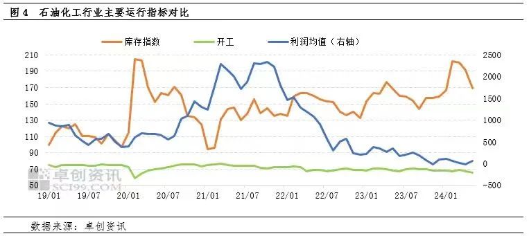 下半年供需矛盾预期逐渐缓解。主要逻辑在于石油化工行业毛利处于偏低水平,虽新增产能不及预期,但开工负荷低位不断调整供应强度,2024年以来需求边际逐渐改善,石化行业整体库存水平呈现下滑趋势,供需矛盾有进一步缓解趋势。分指标来看,当前库存处于历年同期偏高位置。