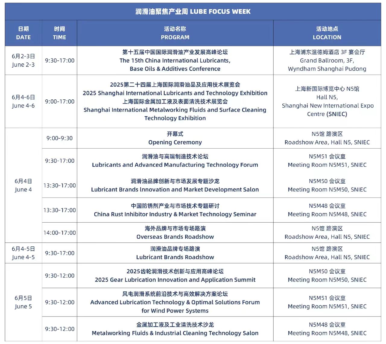 | 6月5-7日 上海·浦东新国际博览中心E7馆 | 第二十三届上海国际润滑油品及应用技术展览会暨上海国际金属加工液及表面清洗技术展览会 | 免费 |