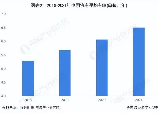 在汽车保有量不断增长的同时,由于汽车制造、维修与保养技术的不断提高,国内汽车的使用年限也在不断增加。从我国汽车的平均车龄来看,2021年我国汽车的平均车龄达到了6.5年。