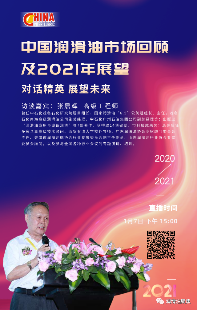 且听张晨辉老师于1月7日(本周四)下午15:00为我们带来21世纪之初的中国润滑油市场回顾以及2021年展望,让我们汲取教训,总结经验,交流心得,共同为促进润滑油行业长足发展做出贡献。